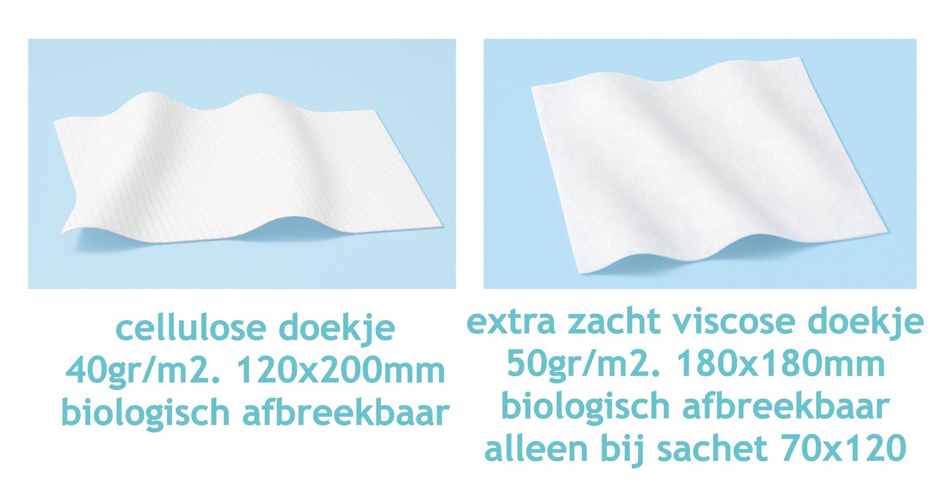 Een extra zacht en sterk viskose doekje van 50gr/m2. Formaat ca. 180x180 mm. Dit is een luxer, dikker en zachter aanvoelend doekje met meer vloeistof en groter absorbtievermogen en eveneens 100% biologisch afbreekbaar. Dit luxe en dikkere doekje past alleen in de grotere sachets van 70x120mm